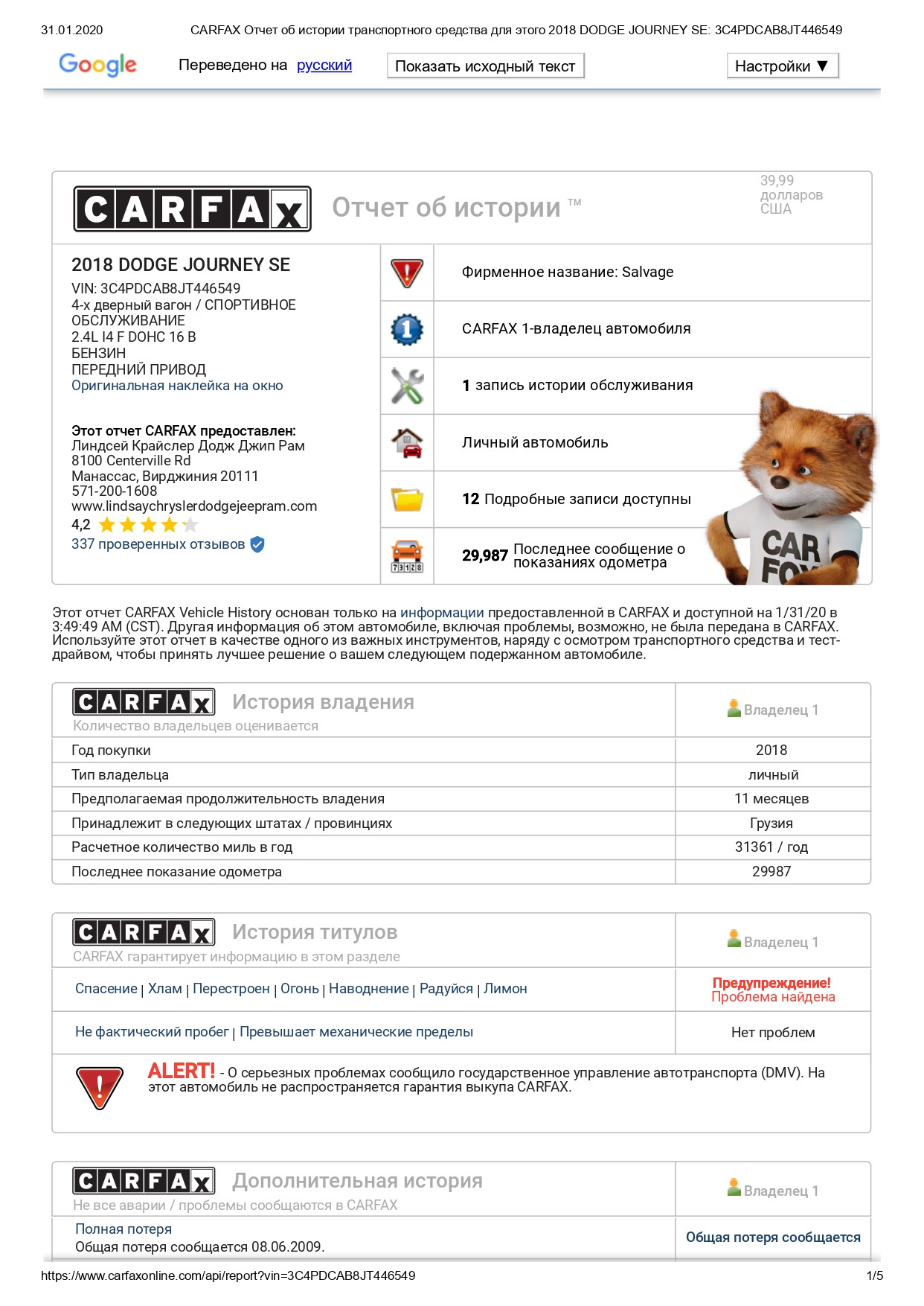 | Пробег | 29 987 миль |